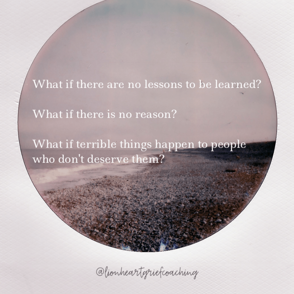 When we believe that “everything happens for a reason” or that someone out in the universe felt it was time for us to learn a lesson, it makes it nearly impossible to accept or process the harder emotions of grief: anguish, anger, powerlessness.